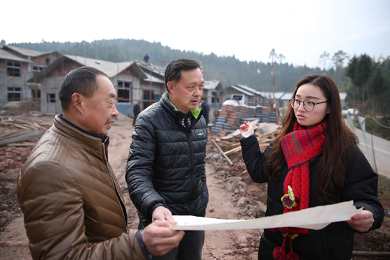 “第一書記”王舒(右一)和村支兩委一班人現(xiàn)場研究村里正在實施的易地扶貧搬遷安置項目。