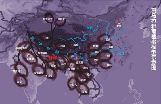 環(huán)珠峰經(jīng)濟(jì)圈“葡萄串”模型(喜馬拉雅是主干,環(huán)10國及其大小城市是“葡萄”)