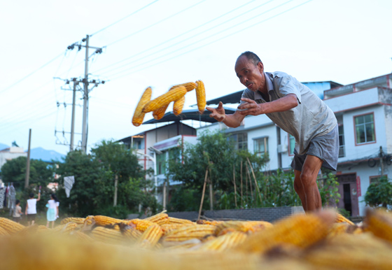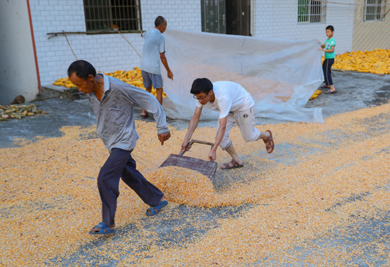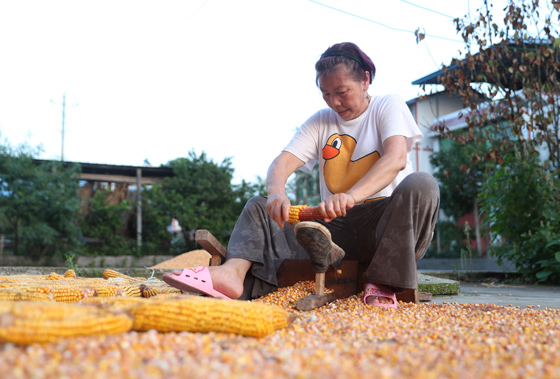 四川省岳池縣引導(dǎo)農(nóng)民因地制宜發(fā)展田坎經(jīng)濟(jì),今年在2萬余畝田坎和邊角地上種植的玉米、大豆、絲瓜等經(jīng)濟(jì)作物,實(shí)現(xiàn)產(chǎn)值4500多萬元,既盤活利用了土地,又增加了農(nóng)民收入。圖為岳池縣臨溪鎮(zhèn)紅廟村的農(nóng)民在脫粒、涼曬、收納“田坎玉米”。