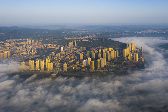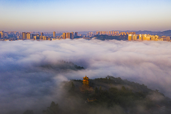 11月11日早晨,四川省廣安市廣安區(qū)渠江兩岸出現(xiàn)美麗的平流霧景觀,晨霧彌漫在幢幢樓宇之間,讓濱江建筑在云霧間若隱若現(xiàn),仿佛被一層層曼妙的輕紗包裹,虛無縹緲,宛若仙境,美不勝收。
