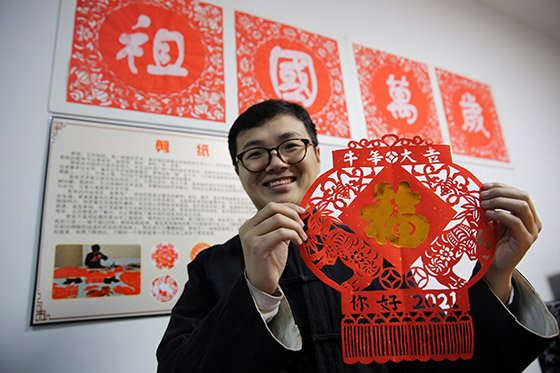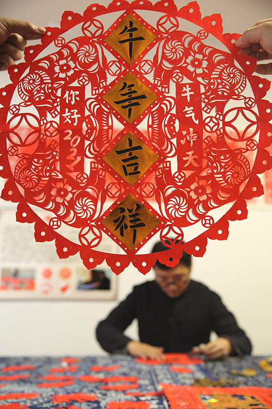 牛年春節(jié)臨近,四川省內(nèi)江市東興區(qū)初級(jí)中學(xué)“90后”教師李有生創(chuàng)作了百余幅以生肖“牛”為主題的系列剪紙作品送給親友,祝福牛年新春。