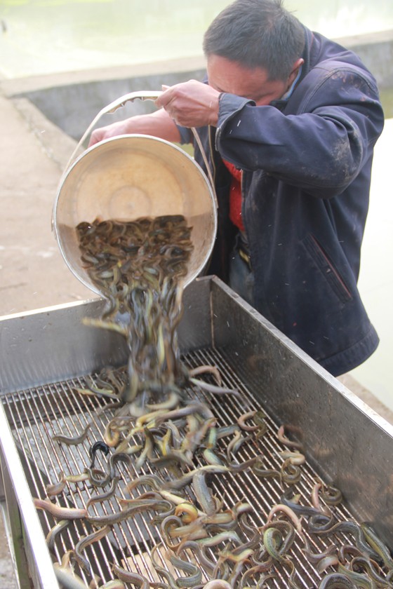 泥鰍養(yǎng)殖基地的工人在篩選成苗