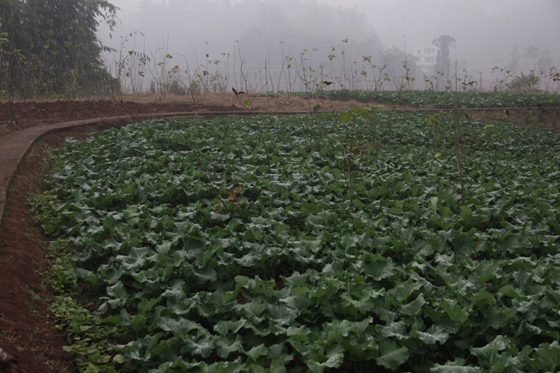 鄉(xiāng)村的冬天,田地里蒙著一層薄薄的霜,一行行應季蔬菜透過薄霜鉆出土地。田邊的山坡上栽種著一排排果桑,透著盈盈的綠,放眼望去,一丘挨著一丘,竟然漫山遍野都是。