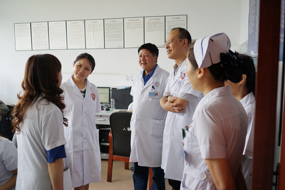 都江堰市人民醫(yī)院執(zhí)行院長于洪濤(右三)深入臨床一線聽取職工意見