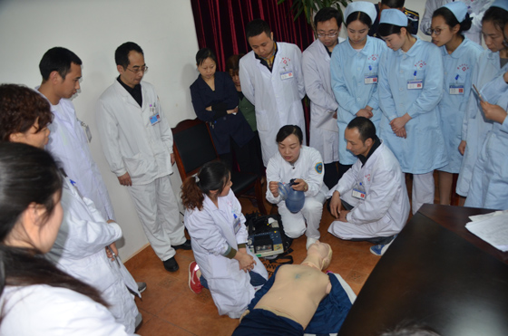 都江堰市人民醫(yī)院急診科主住楊鼎君和副護士長曠娟正在對崇義鎮(zhèn)醫(yī)護人員進行急救技能講座和培訓(xùn)